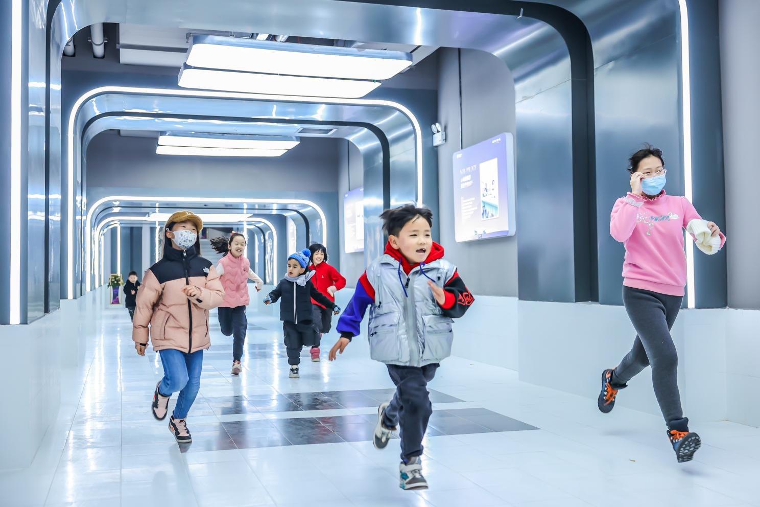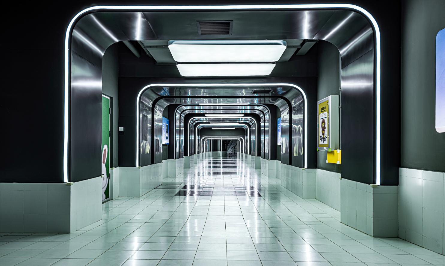 “彩虹通道”位于和平一校&126中学和平湾校区和方大·长白一品园区内,全长贯通园区地下至教学楼区域,通道宽近5米、高约3米,空间规模堪比机场航站通道。