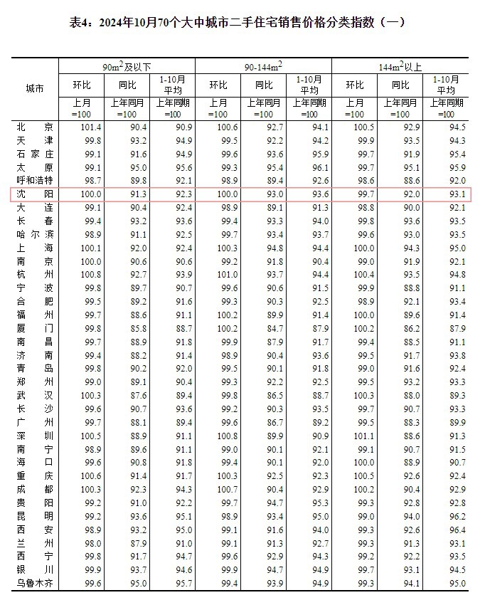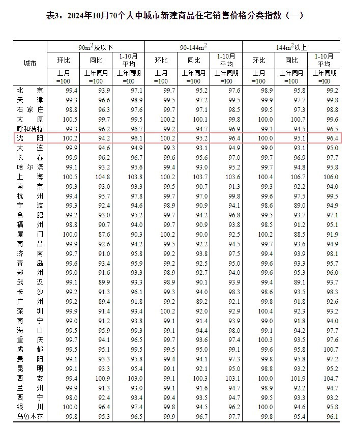 11月15日上午,国家统计局发布了2024年10月份70个大中城市商品住宅销售价格变动情况。由于10月份的火爆行情,大家都很期待这份数据的出炉。果然,随着国家统计局的数据发布,沈阳市民没有失望。