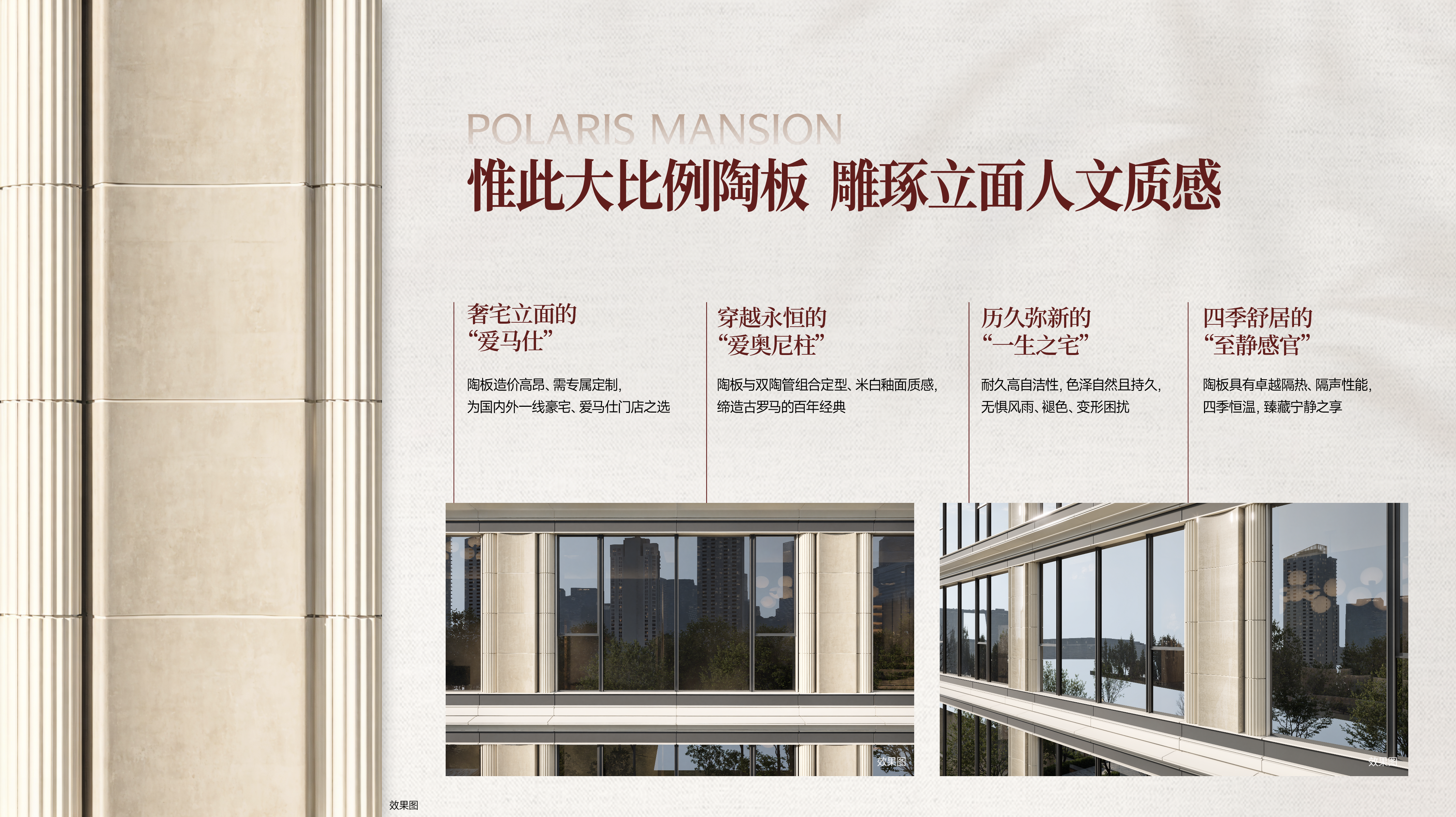 为匹配盛京中轴的地脉身份,项目立面臻选定制款陶板,与爱马仕门店同款选材。陶板与双陶管组合定型,米白釉面质感致敬古罗马百年经典,兼具卓越隔热、隔声性能,实现四季恒温与持久色泽,铸就不褪色的优雅本色。