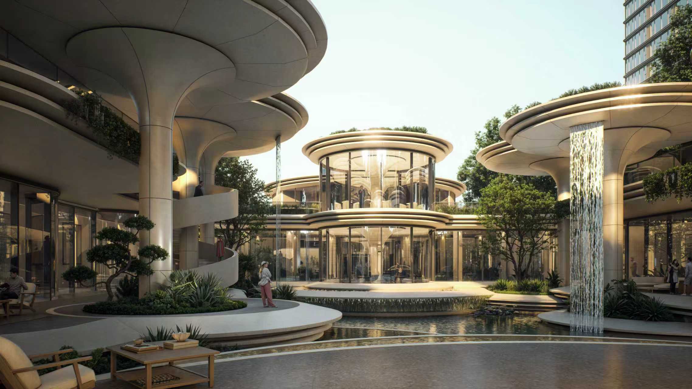 在材质选择上,团队进行了10轮的反复甄选,最终以大面积连续玻璃与低碳建材为基础。融合米白与米黄为主色调,通过现代技艺重新诠释古典柱式、飞檐等细节,创造出一种前所未有的视觉张力与建筑语言。