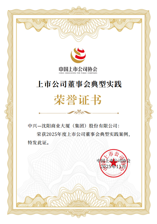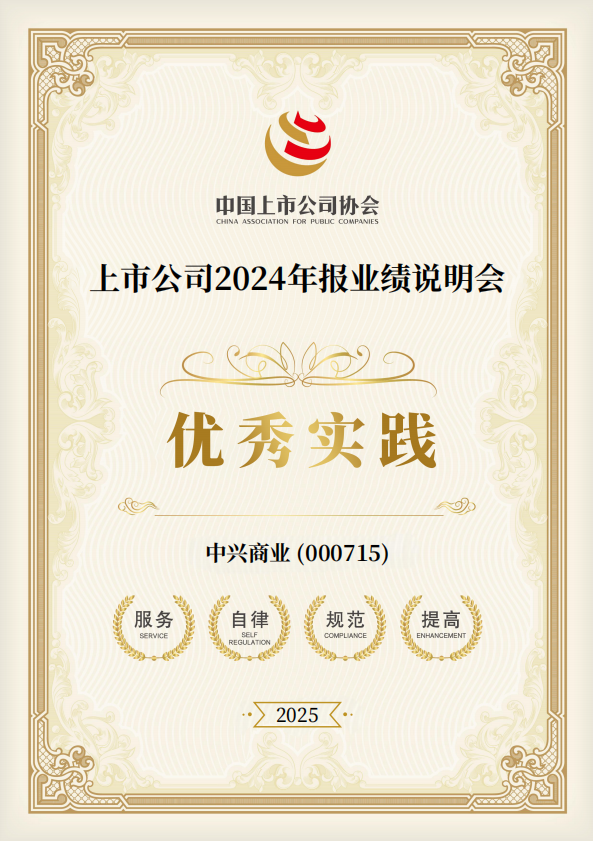 近日,中国上市公司协会(以下简称“中上协”)发布2025年A股上市公司评价结果,中兴商业凭借在公司治理、信息披露、投资者关系管理等领域的突出表现,一举斩获“2025年度上市公司董事会典型实践”“2025上市公司董事会办公室优秀实践”以及“上市公司2024年报业绩说明会优秀实践”三项重要荣誉,彰显其在规范运作与治理效能提升方面的行业标杆地位。